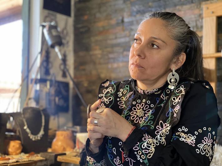 Cada rincón de su hogar da cuenta del origen de esta orfebre y artista. Un telar que ocupa para obras de mayor tamaño y uno más pequeño en el que trabaja para sus joyas. Kultrün, imágenes de pueblos originarios de Chile, cerámicas de mujeres que representan la cosmovisión mapuche, tazones en cerámica -confeccionados por ella- que tienen como imagen central a la araucaria de la zona que visita habitualmente y que la energiza y enorgullece.