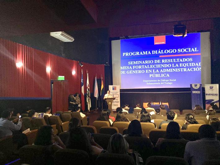 En el marco del proyecto financiado por la Subsecretaría del Trabajo, el pasado viernes 18 de noviembre en el Teatro Municipal de San Fernando, se llevó a cabo el seminario final de la Mesa de Diálogo Social sobre enfoque de género en la administración pública.