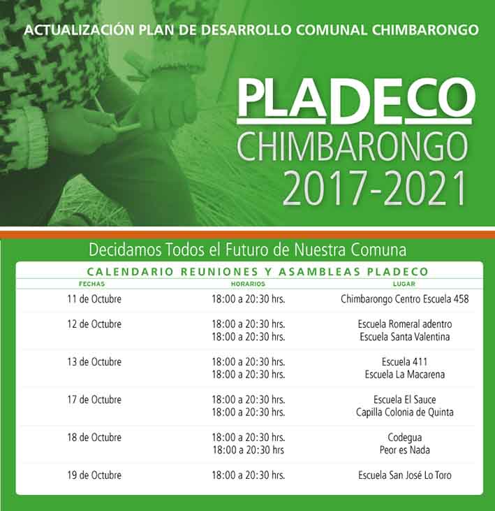 El PLADECO (Plan de Desarrollo Comunal), es el documento, donde el municipio de Chimbarongo junto a las organizaciones comunitarias y los vecinos, construyen una visión deseada de la comuna y definen los lineamientos estratégicos y proyectos por ámbito del desarrollo.