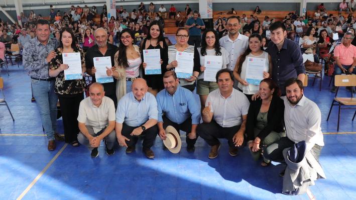 La primera ceremonia se llevó a cabo en el gimnasio del polideportivo Guillermo Chacón, en Machalí, a la que asistieron 150 familias de los comités Creciendo Juntos y Pablo Neruda II, quienes recibieron subsidios del Fondo Solidario de Vivienda (DS.49), para la construcción de sus viviendas en el sector nororiente de la comuna.