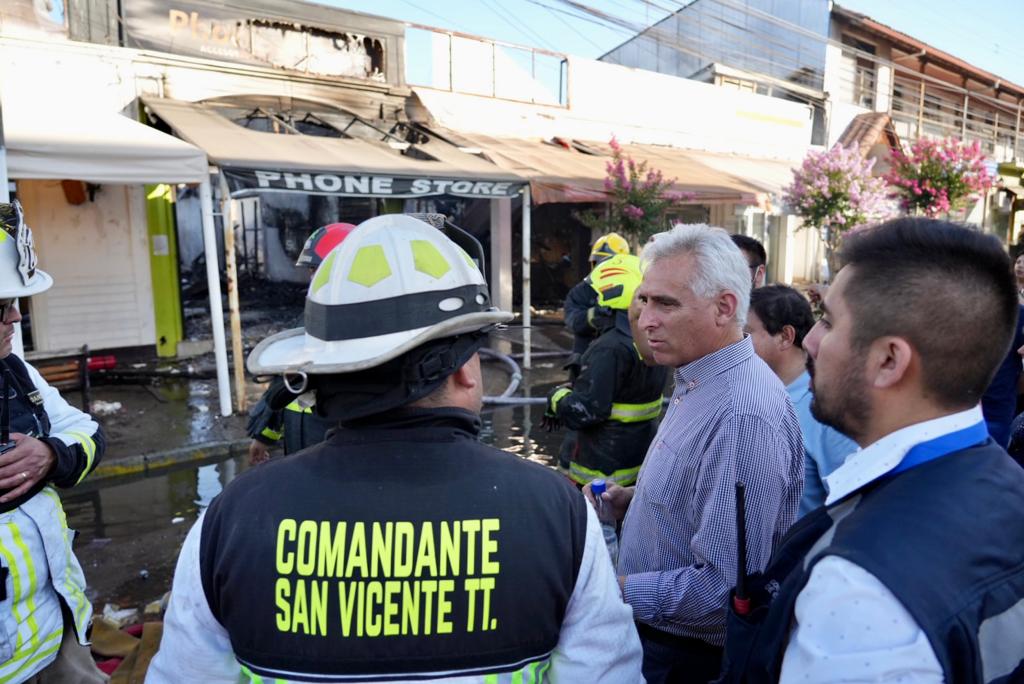 Tras el grave incendio que afectó a diversos locales comerciales, oficinas y residencias ubicadas en el centro de San Vicente, el Gobernador Regional Pablo Silva Amaya llegó al lugar para informarse de la situación, a través de los cuerpos de Bomberos y los equipos de Emergencia que trabajaron arduamente en el sitio del siniestro.