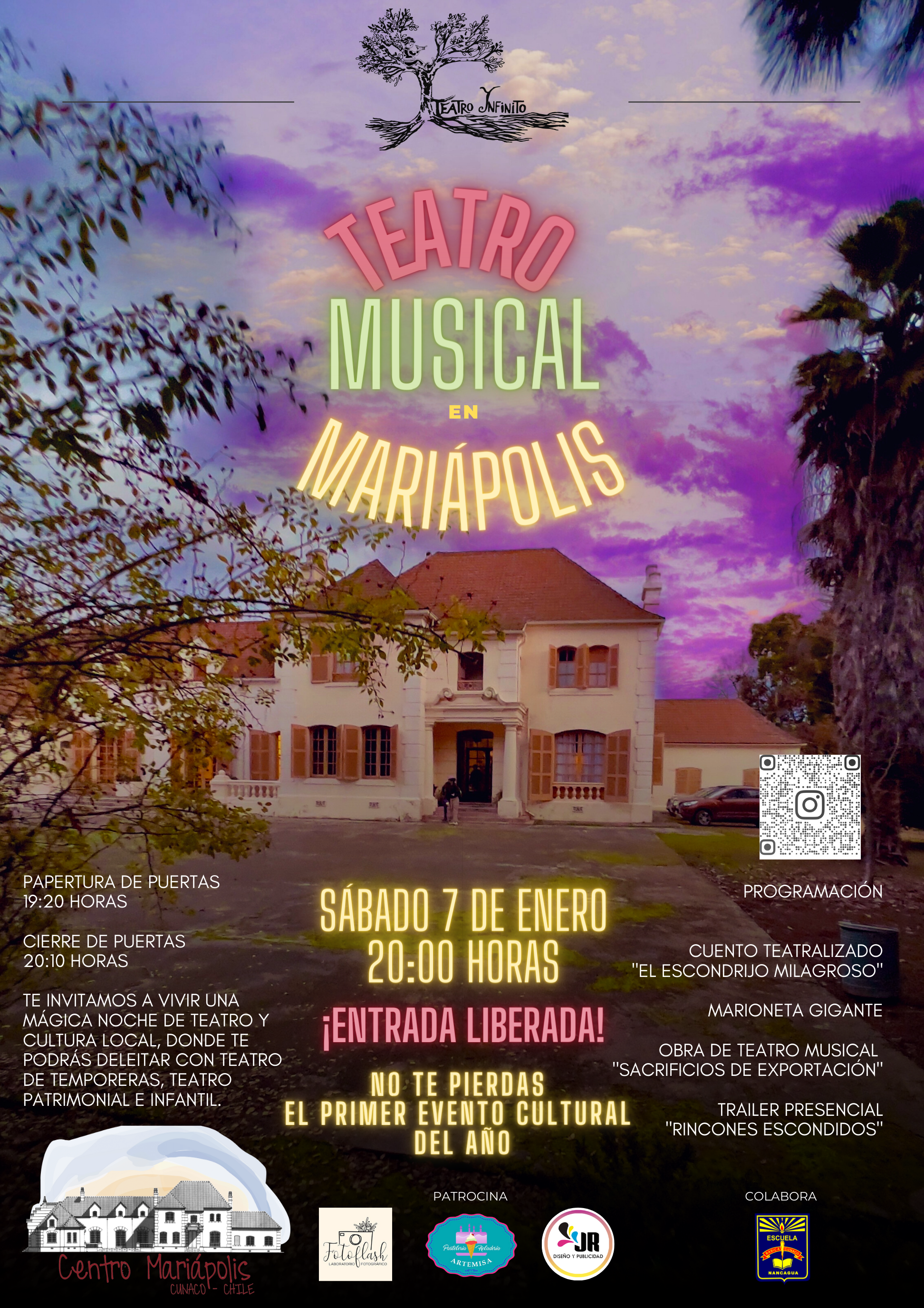Invitamos a la comunidad a vivir la magia de las artes escénicas en el primer evento cultural masivo de Teatro Infinito el próximo sábado 07 de enero a las 20 horas.