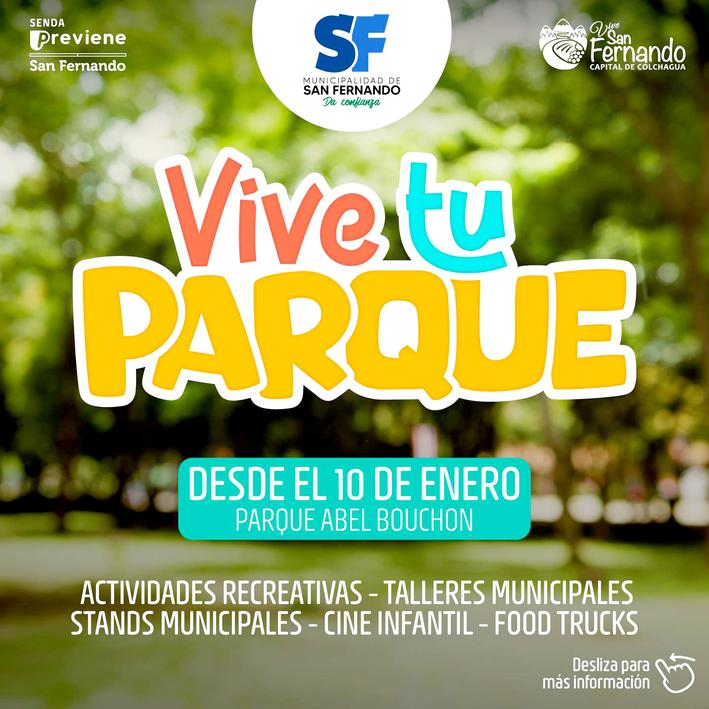 Este martes 10 de enero, a las 19:30 horas, se dará por inaugurado un nuevo programa municipal “Vive Tu Parque”, instancia a través de la cual la administración del alcalde Pablo Silva Pérez busca que toda la familia sanfernandina vuelva a apropiarse del tradicional Parque Abel Bouchon.