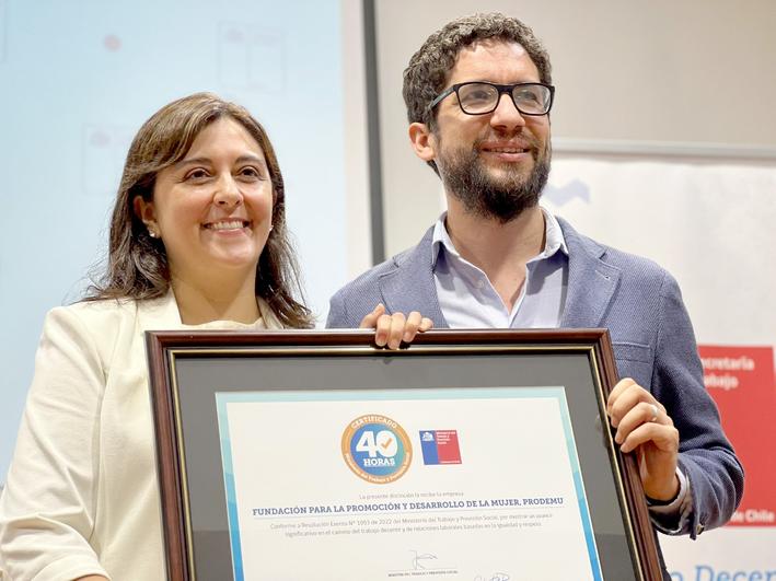 En una amena ceremonia realizada en las dependencias de la Fundación Prodemu, el subsecretario del Trabajo, Giorgio Boccardo, junto a la directora nacional, Marcela Sandoval, celebraron con las y los funcionarios de esta institución al ser una más en certificarse por implementar una jornada laboral de 40 horas semanales, como una acción concreta de fomento al trabajo decente y al desarrollo de un buen vivir.