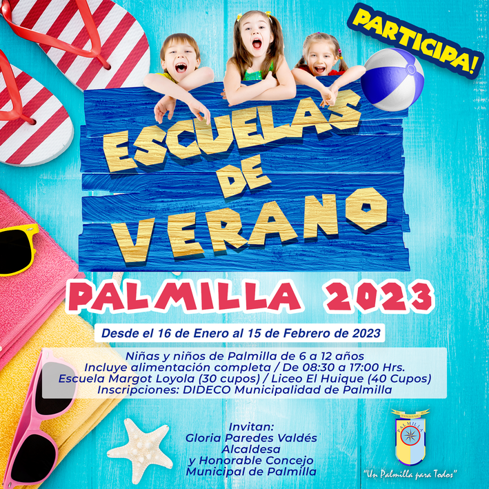 La alcaldesa de Palmilla, Gloria Paredes Valdés, anunció que se encuentran abiertas las inscripciones para las Escuelas de Verano, que desde el 16 de enero y hasta el 15 de febrero, atenderá a 70 niños en la escuela Margot Loyola Palacios de Palmilla Centro (30 cupos) y Liceo San José del Carmen del El Huique (40 cupos), y que sus edades fluctúen entre los 6 y 12 años y que funcionará de lunes a viernes de 08:30 a 17 horas.