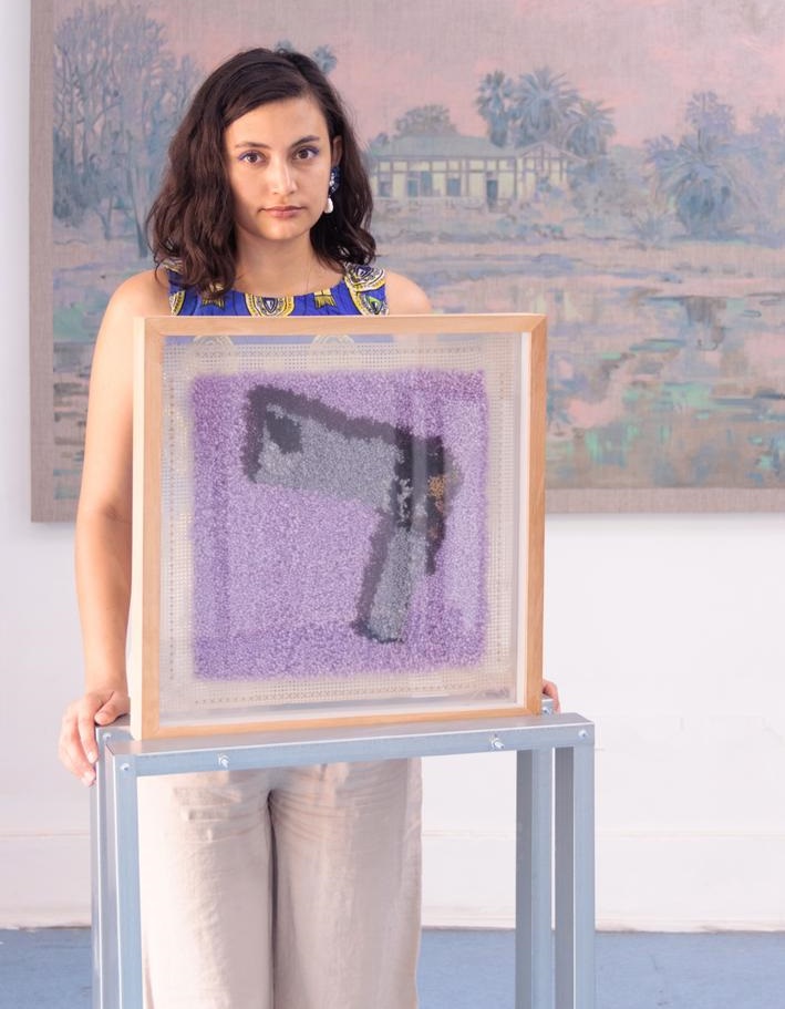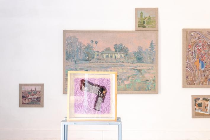 Las obras en textil observan miradas satelitales de inmuebles patrimoniales, planteando una traducción del píxel al punto bordado, con diferentes grados de tridimensionalidad, permitiendo ser observadas por sus dos lados, sin contener un reverso o un anverso, jugando con diferentes texturas y colores, se observan abstractas, casi geométricas.