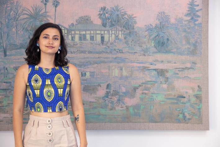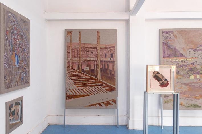 Por otro lado, las pinturas de gran formato provienen de fotografías antiguas de desconocidos. Estas se acercan al textil al incorporar el color de la tela cruda, a la vez exploran a través de las capas la memoria interna de la pintura, sobre todo a partir de la transparencia que deja visible el trazo y el movimiento de la mano sobre la tela, desenvolviéndose de manera suelta. Así, el paisaje de Sewell, las termas del Flaco o el Liceo Neandro Schilling se vuelve también oportunidades para experimentar el color y la materialidad de la pintura.