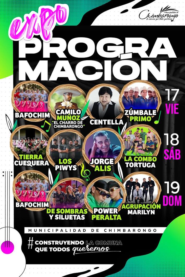 El día viernes 17 de marzo a partir de las 20 horas se presentará BAFOCHIM, Camilo Muñoz “El Charro de Chimbarongo”, el humorista Centella y Zúmbale Primo. Al día siguiente, sábado 18, se subirá al escenario Tierra Cuequera, Los Piwys, Jorge Alis y la Combo Tortuga. Finalmente, el domingo 19 de marzo, cerrarán la versión 2023 de #Expomimbre, BAFOCHIM, De Sombras y Siluetas, Power Peralta y Agrupación Marilyn.