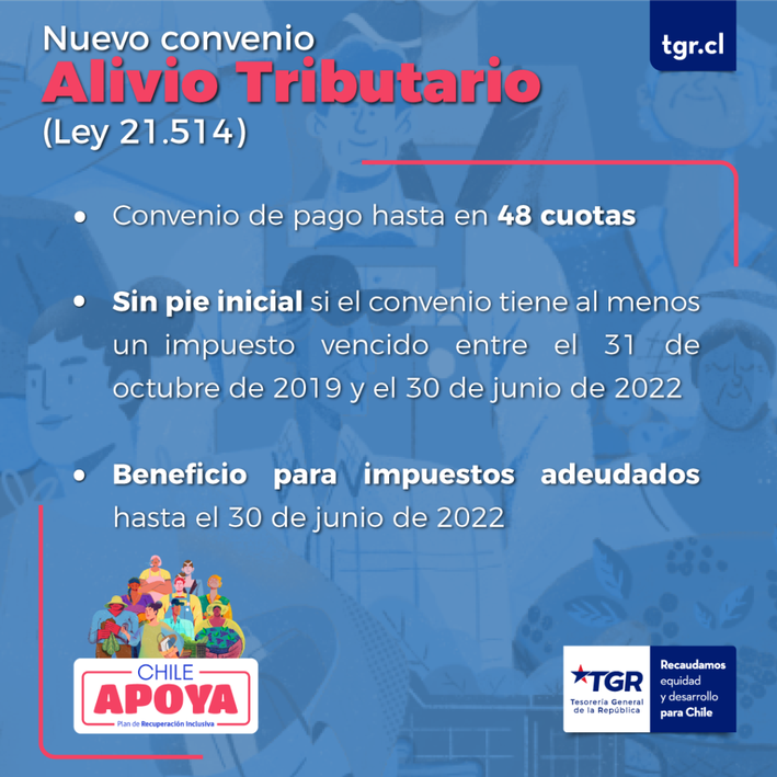 La Ley 21.514 entró en vigencia el 3 de diciembre pasado y permite a los contribuyentes con deudas tributarias y contribuciones vencidas al 30 de junio del año pasado, pagar éstas al contado, sin multas ni intereses; o bien suscribir un convenio de pago con la Tesorería, para el pago mediante cuotas mensuales hasta en 48 cuotas, también sin el cobro de multas ni intereses acumulados.