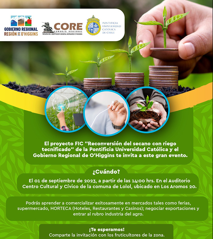 Bajo el alero del proyecto FIC “Reconversión del secano con riego tecnificado”, ejecutado por la Pontificia Universidad Católica de Chile y financiado por el Fondo de Innovación para la Competitividad del Gobierno Regional de O’Higgins, el evento “Seminarios de Negocios” ya tiene fecha y espera convocar a más de 100 asistentes relacionados a la agricultura y fruticultura regional.