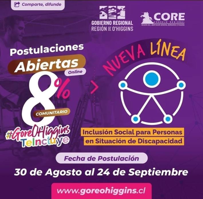 Estimada comunidad, es una enorme alegría para mi comentar que el Gobierno Regional de la región de O´Higgins es pionero a nivel nacional en el lanzamiento del 8% Comunitario de Inclusión del Fondo Nacional de Desarrollo Regional.