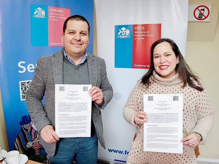 El director regional del Fondo de Solidaridad e Inversión Social, FOSIS, David Mella Banda y su par del Servicio Nacional de la Mujer y la Equidad de Género, SERNAMEG, María Avello Rifo firmaron un convenio de colaboración que busca que mujeres que se encuentran en situación de vulnerabilidad puedan acceder a los distintos beneficios y programas de ambas instituciones.