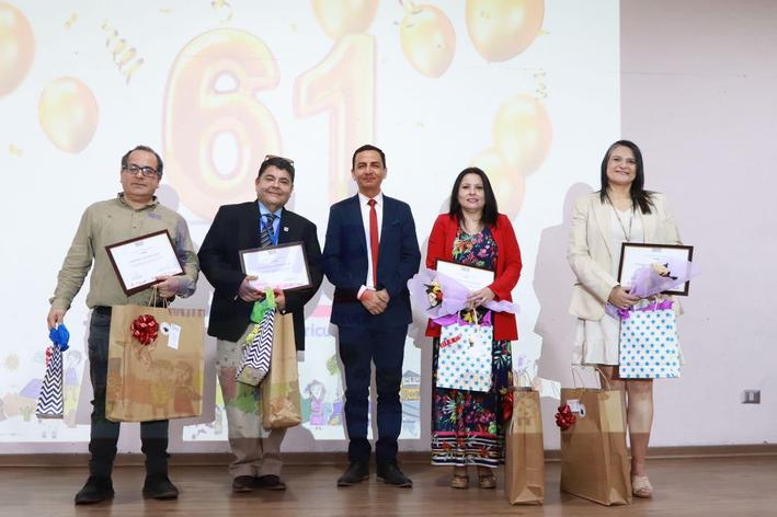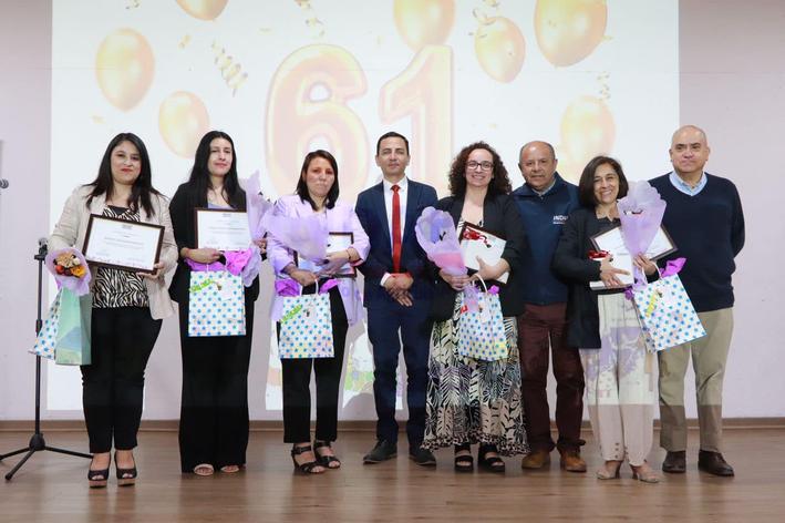 Asimismo, expresó sus felicitaciones y entregó los premios institucionales a los funcionarios galardonados. Se premió por 15 años de servicio a Ligia Castillo Espinoza, Claudia Figueroa Vargas, Rosa Garrido Tobar, Nayadet Olguín Bartsch, Viviana Parraguez, María Victoria Silva y Lucía Urra Carrasco. Por 20 años de servicio recibieron reconocimientos Adriana Amaro Osorio, Patricia Fredes Riveros, José Gallardo Murgam y Juan Pablo Vergara. Por 25 años de servicio se premió a Juana Madrid Neira y Karin Ulloa Amaro; por 30 años a Byron Blamey Larenas y Sergio Nenen Campos; y por 35 años de servicio a Sergio Núñez Varas y Nora Pérez Reyes. La Asociación de Funcionarios -ANFI- y los colegas también hicieron entrega de obsequios a los galardonados.