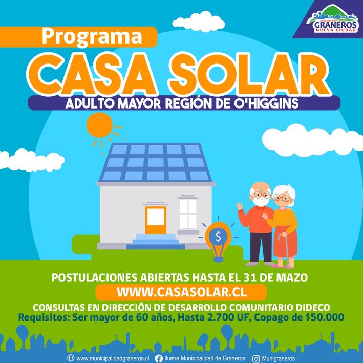 Los adultos mayores de la comuna de Graneros podrán postular al programa “Casa Solar Social”, iniciativa que es un esfuerzo conjunto por acercar las energías renovables y aliviar la carga de las cuentas de energía eléctrica o luz domiciliaria.