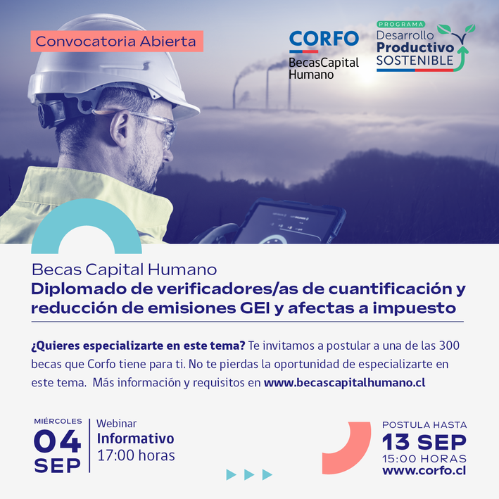 Ante la necesidad de impulsar el desarrollo de una industria sostenible y contar con especialistas con competencias para verificar, cuantificar y reducir las emisiones de Gases de Efecto Invernadero (GEI), y otras afectas a impuesto, Corfo abrió un nuevo llamado para entregar 300 becas a técnicos y profesionales que cuenten con algún grado de experiencia o estudios relacionados con el tema de cambio climático. Se trata de un diplomado de 90 horas que será otorgado por la Universidad Católica de Valparaíso en formato online.