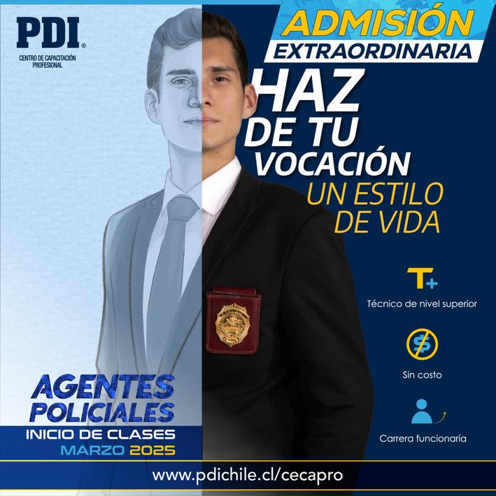 Los detalles de la convocatoria están disponibles en el sitio web www.pdichile.cl/cecapro, desde donde pueden realizar la postulación en línea. Además, de seguir las informaciones publicadas en las cuentas institucionales por las Redes Sociales de X, Instagram, Facebook y TikTok @cecapro_pdi y @PDI_CHILE. Las postulaciones son hasta el 14 de febrero.
