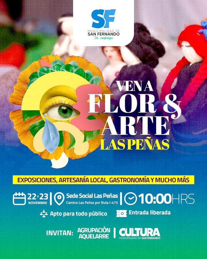 Este sábado 22 y domingo 23 de noviembre en la localidad de Las Peñas, en la precordillera de la comuna de San Fernando, se llevará a efecto la tradición actividad denominada “Flor y Arte” organizada por la agrupación Aquelarre y que consiste en una exposición de plantas, flores de primavera, artesanía local y gastronomía cordillerana.