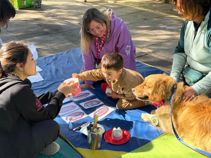 La estrategia incorporó canoterapia, una técnica de intervención asistida por perros entrenados que busca disminuir el estrés, facilitar la regulación emocional y crear ambientes terapéuticos seguros. En esta experiencia, la presencia de Balú, una perrita de asistencia, actuó como un puente emocional entre los niños y el equipo odontológico, ayudando a disminuir la tensión y promover la confianza necesaria para avanzar en los procedimientos educativos y preventivos.