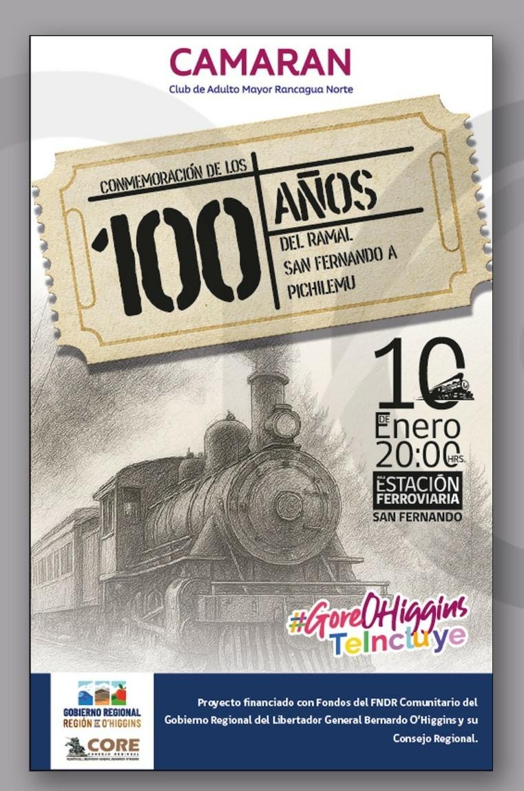 Este sábado 10 de enero, a las 20:00 horas, la Estación Ferroviaria de San Fernando se llenará de historia, emoción y risas para conmemorar los 100 años del recordado ramal San Fernando-Pichilemu.