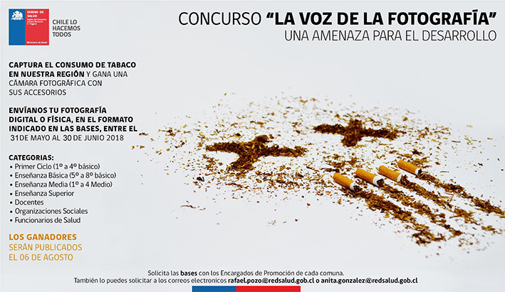 El objetivo de la segunda versión del concurso "la voz de la fotografía", es empoderar a la población en la promoción de ambientes libres de humo de tabaco, que contribuyan a la disminución de la prevalencia del tabaquismo en la población, mediante una estrategia participativa e inclusiva, en la cuál a través de la fotografía, se observe lo que ocurre actualmente a nivel comunal y regional, con el cumplimiento e incumplimiento de la Ley de Tabaco (Ley 20660) en todos sus ámbitos.