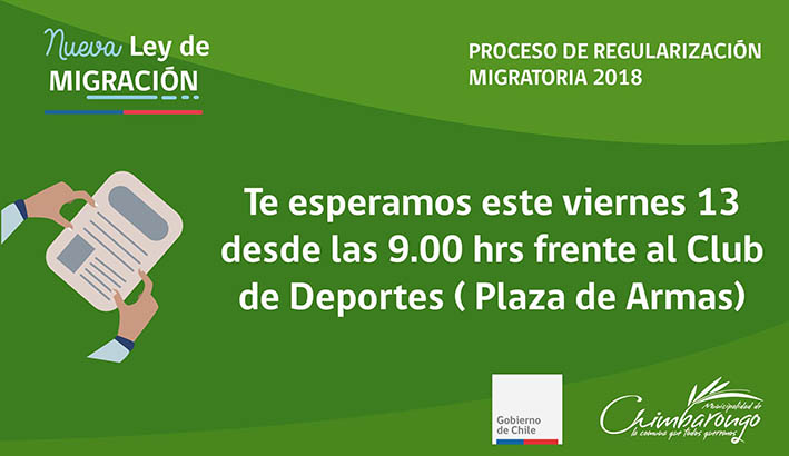 Una de las solicitudes del alcalde Marco Contreras ha sido realizar la integración con todos los chimbaronguinos, por lo mismo desde la Dirección de Desarrollo Comunitario, se coordinó junto a la Gobernación de Colchagua realizar en la comuna el "Proceso de regularización migratoria" que finaliza en nuestro país el día 22 de julio, por ende, es poco el tiempo que le quedan a los inmigrantes que no tengan regularizada su situación. Este viernes 13 de julio desde las 09:00 hasta las 14:00 horas estará ubicado un bus frente al Club de Deportes para poder realizar este importante trámite.
