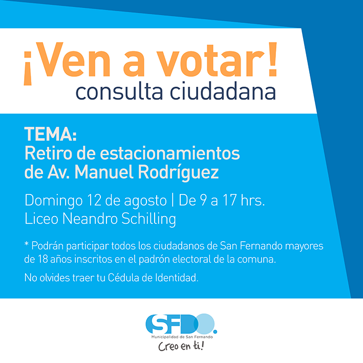 El alcalde de San Fernando dijo que "Esta Consulta Ciudadana tiene por objetivo conocer la preferencia de los ciudadanos de la comuna, con respecto al retiro de los estacionamientos en la Avenida Manuel Rodríguez, entre la línea férrea por el oriente y Calle Olegario Lazo por el poniente, de lunes a sábado de 9:00 a 20:00 horas".