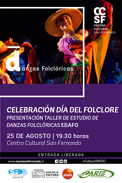 Este sábado 25 de agosto del presente a las 19:30 horas en el Centro Cultural de San Fernando, se realizara la celebración del día del folclor, en donde contara con la participación por primera vez en esta ciudad del taller de Estudio de Danzas Folclóricas EDAFO.