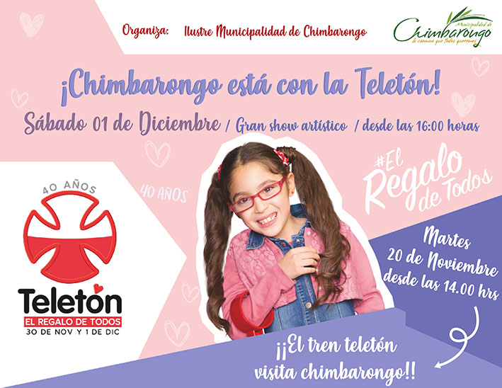 La Municipalidad de Chimbarongo, encabezada por el alcalde Marco Contreras, en conjunto con la Fundación Teletón han organizado para el martes 20 de noviembre a partir de las 14:00 Horas la visita de la Gira Teletón, así que el Tren nuevamente se detendrá en nuestra estación para que los rostros y artistas se bajen y se presenten ante nuestro público en el escenario central de la Plaza de Armas.
