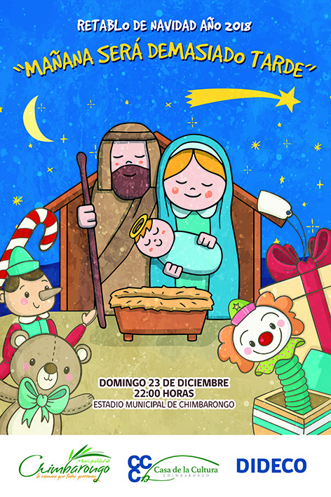 Es una tradición en "La comuna que todos queremos" y se perdió por más de 12 años, sin embargo, la administración encabezada por el alcalde Marco Contreras rescató está sana costumbre chimbaronguina y ya vamos por el tercer retablo navideño consecutivo, entregando un mensaje reflexivo con un increíble espectáculo; este jueves 20 de diciembre a las 22:00 horas en el Estadio de Tinguiririca y el domingo 23 de diciembre en el mismo horario en el Estadio Municipal de Chimbarongo.