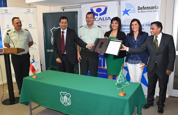 El presidente de la Corte de Apelaciones, Michel González; el director regional de Gendarmería, Alejandro Fuentes; la juez presidenta del Tribunal de Juicio Oral en lo Penal (TOP) de Rancagua, Paulina Chaparro; el fiscal regional (s), Gabriel Meza y la defensora regional (s), Carolina Alvarado, firmaron un protocolo interinstitucional para lectura de sentencias por videoconferencia.