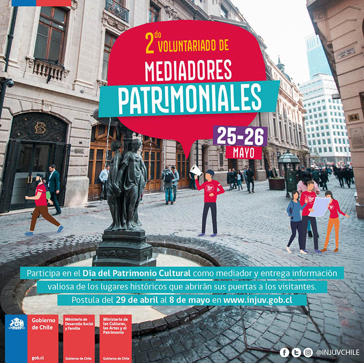 La postulación se realiza de manera online hasta este miércoles 8 de mayo de 2019 en la página web www.injuv.gob.cl. Durante la celebración del Día del Patrimonio, los mediadores tendrán la misión de guiar recorridos, entregar información respecto a los circuitos y/o colaborar con apoyo logístico durante las jornadas. Todos los voluntarios recibirán una capacitación que busca enriquecer la experiencia tanto de los mediadores como de la ciudadanía.