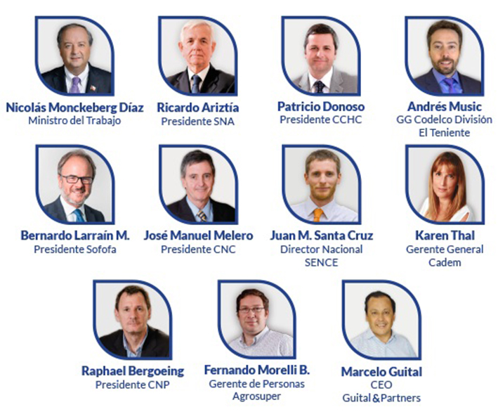 El primer panel estará integrado por Ricardo Ariztía, presidente de la Sociedad Nacional de Agricultura (SNA); Bernardo Larraín, presidente de la Sociedad de Fomento Fabril (Sofofa); Andrés Music, gerente general de Codelco Chile División El Teniente; Patricio Donoso, presidente de la Cámara Chilena de la Construcción (CChC), José Manuel Melero, presidente de la Cámara Nacional de Comercio (CNC), quienes abordarán el tema de la "transformación del trabajo" desde los diversos sectores que representan y sus desafíos para ser productivos y competitivos.