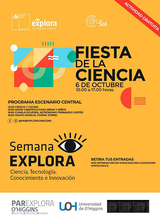 Este domingo 6 de octubre la región celebrará una fiesta ciudadana e inclusiva invitando a todos sus habitantes a disfrutar y entretenerse en torno a la ciencia, la tecnología, la innovación y el conocimiento. El proyecto asociativo regional PAR Explora O'Higgins implementado en la región por la Universidad de O'Higgins, han organizado una semana llena de actividades gratuitas, ferias escolares y conferencias en diversas ciudades de la región, entre el 6 y 11 de octubre próximo, de manera simultánea, propiciando un espacio de encuentro y participación en torno a la ciencia.