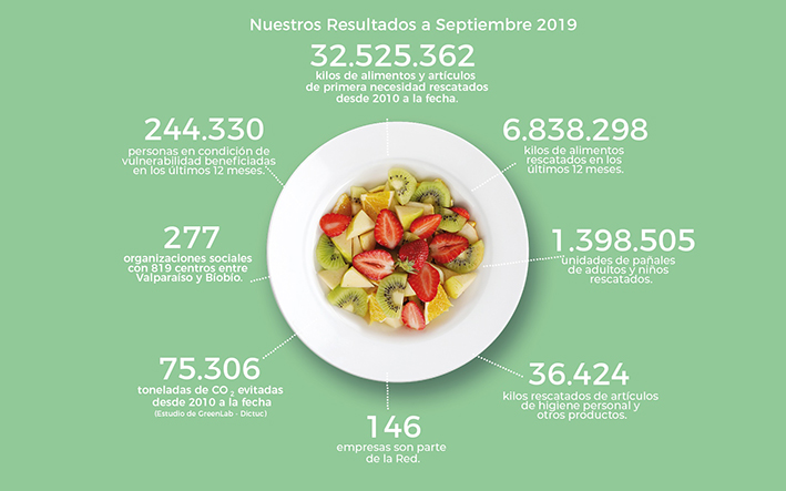 Red de Alimentos ha rescatado sólo en los últimos 12 meses cerca de 7 millones de kilos gracias al apoyo de 146 empresas de diversos rubros, para que lleguen a las manos de 244.330 personas en situación de vulnerabilidad de diversos rangos etarios, por intermedio de 277 organizaciones sociales pertenecientes a las regiones de Valparaíso, Metropolitana, O'Higgins, Maule, Ñuble y Biobío. /