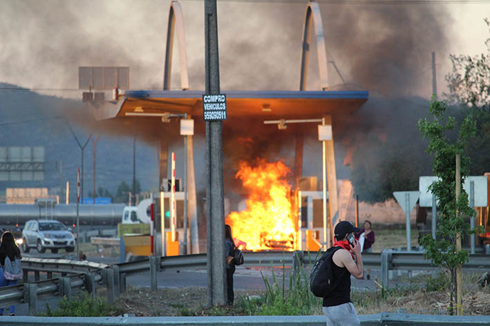 En ese instante, algunos participantes en la movilización prendieron fuego a la garita de peaje en este acceso, situación que motivó a carabineros y bomberos acudir al lugar para controlar la situación.