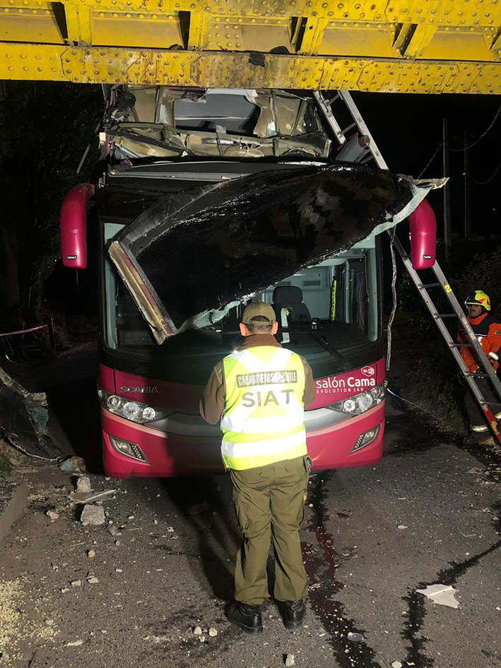 - Una persona falleció y otras 20 resultaron lesionadas luego que un bus de la empresa EME Bus chocara violentamente en el paso bajo nivel La Troya en la comuna de San Fernando. Uno de los pasajeros que iba en el segundo piso del bus falleció en forma instantánea.
