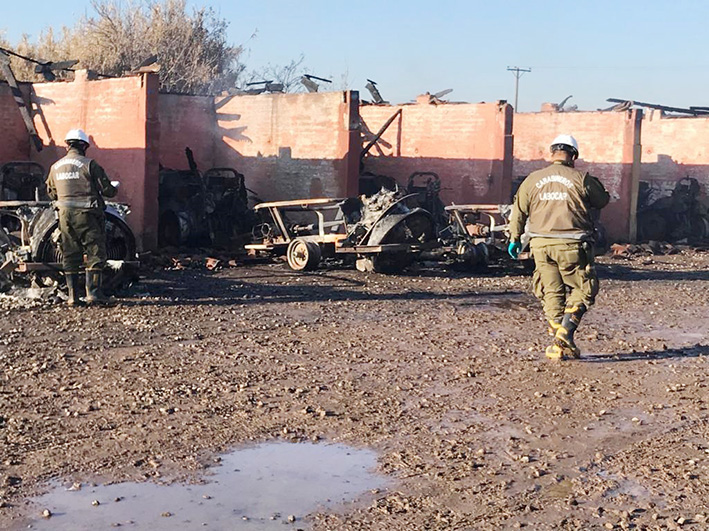 El fiscal de turno dispuso que la brigada especializada de carabineros se constituyera en el sitio de suceso con la finalidad de levantar algún tipo de evidencia que permita determinar las causas que originaron el devastador incendio. Asimismo, se hizo presente en el lugar la Sección de Encargo y Búsqueda de Vehículos, SEBV, para analizar y periciar la maquinaria afectada.