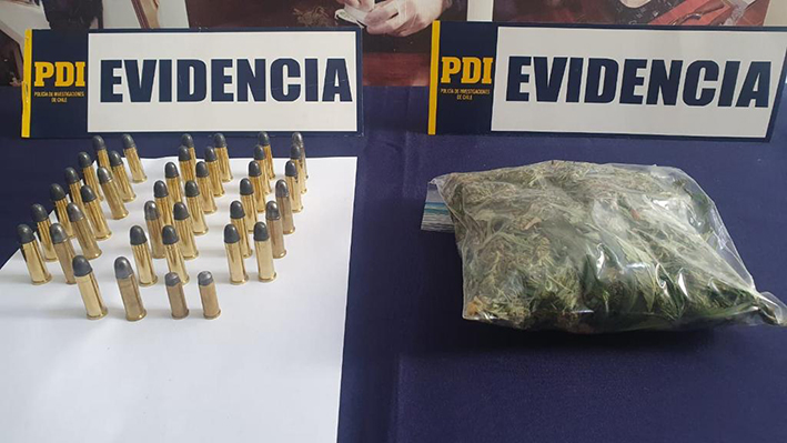 Al interior de la vivienda, los detectives encontraron 111 gramos de cannabis procesada y cuatro plantas de la misma especie, droga avaluada en 2,5 millones de pesos. Asimismo, durante el allanamiento fueron encontrados 38 cartuchos de munición calibre .38 y dos cartuchos calibre .32.