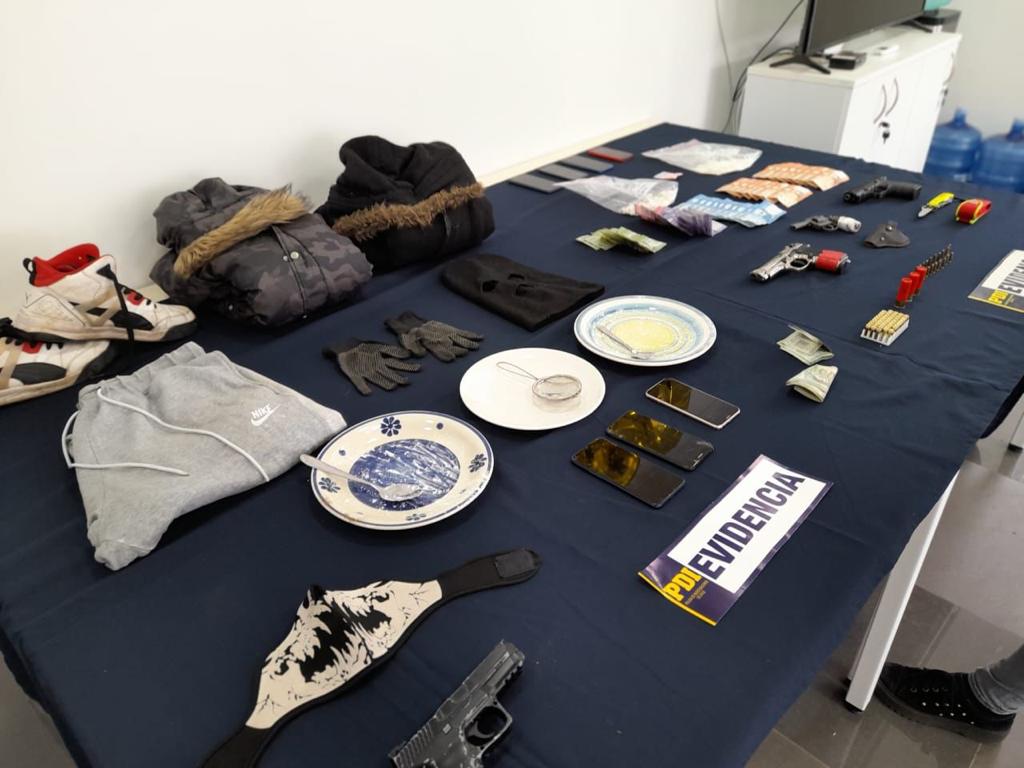 De igual manera, los policías encontraron en las viviendas 67 cartuchos de munición de diverso calibre, 5,1 gramos de ketamina, 126,3 gramos de cocaína base, 454 mil pesos en efectivo, dos armas a fogueo, una pistola convencional, un revolver, además de gorros pasamontañas y vestimentas que los posicionarían a los imputados en el sitio del suceso.