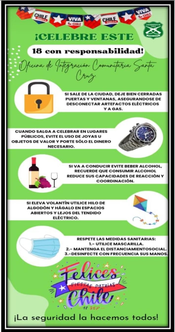 Con el propósito de promover el autocuidado y seguridad durante estas Fiestas Patrias, carabineros de la Oficina de Integración Comunitaria de la Segunda Comisaría de Santa Cruz concurrió hasta el sector céntrico de esta ciudad a fin de entregar recomendaciones generales a las personas tendientes a evitar que sean víctimas de robos u otros delitos similares.