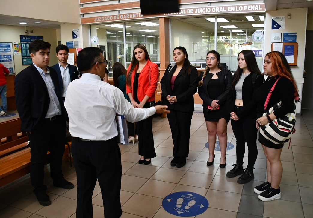 Como una forma de observar en la práctica los conocimientos obtenidos en el aula y conocer el trabajo que se desarrolla en el juzgado, los estudiantes recorrieron las dependencias del tribunal y presenciaron audiencias de formalización.