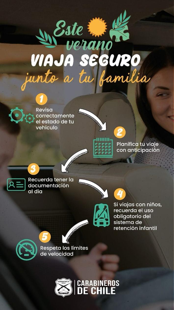 Las vacaciones son un período esperado por todos y para disfrutarlo sin percances. Carabineros de la Sexta Zona ha entregado una serie de recomendaciones relativas al cumplimiento de las leyes del tránsito, al momento de trasladarse de un lugar a otro.