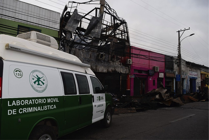 La Sección Criminalística de Carabineros Rancagua (LABOCAR), investiga las causas y dinámica del incendio que el fin de semana consumió cuatro locales comerciales en la capital regional.