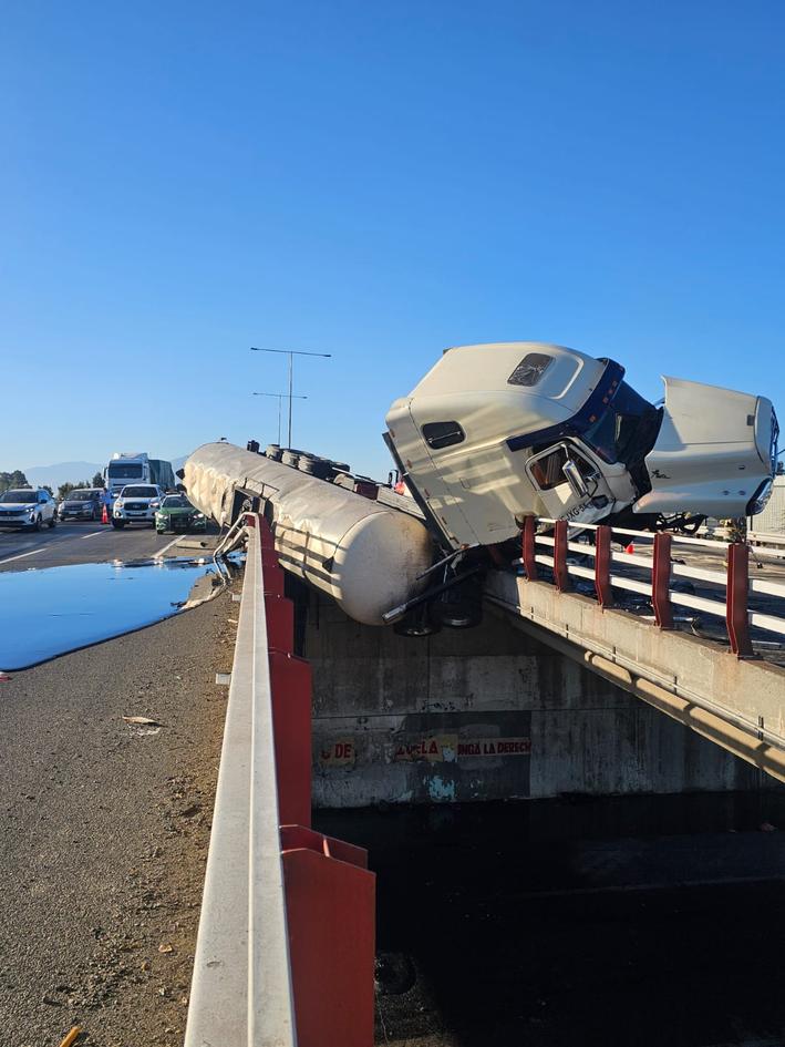 El volcamiento ocurrió cerca de las ocho de la mañana de hoy en el kilómetro 135 de la Ruta 5 Sur, cuando un vehículo que transportaba alquitrán, transitaba en dirección hacia el norte, cuando el conductor perdió el control de la máquina y se estrelló contra las barreras de contención y quedando semicolgado del puente bajo nivel del sector con la cabina relativamente destrozada y con el cargamento perforado y derramado en la ruta en la cual transitaba, en el hecho no se registraron personas lesionadas.