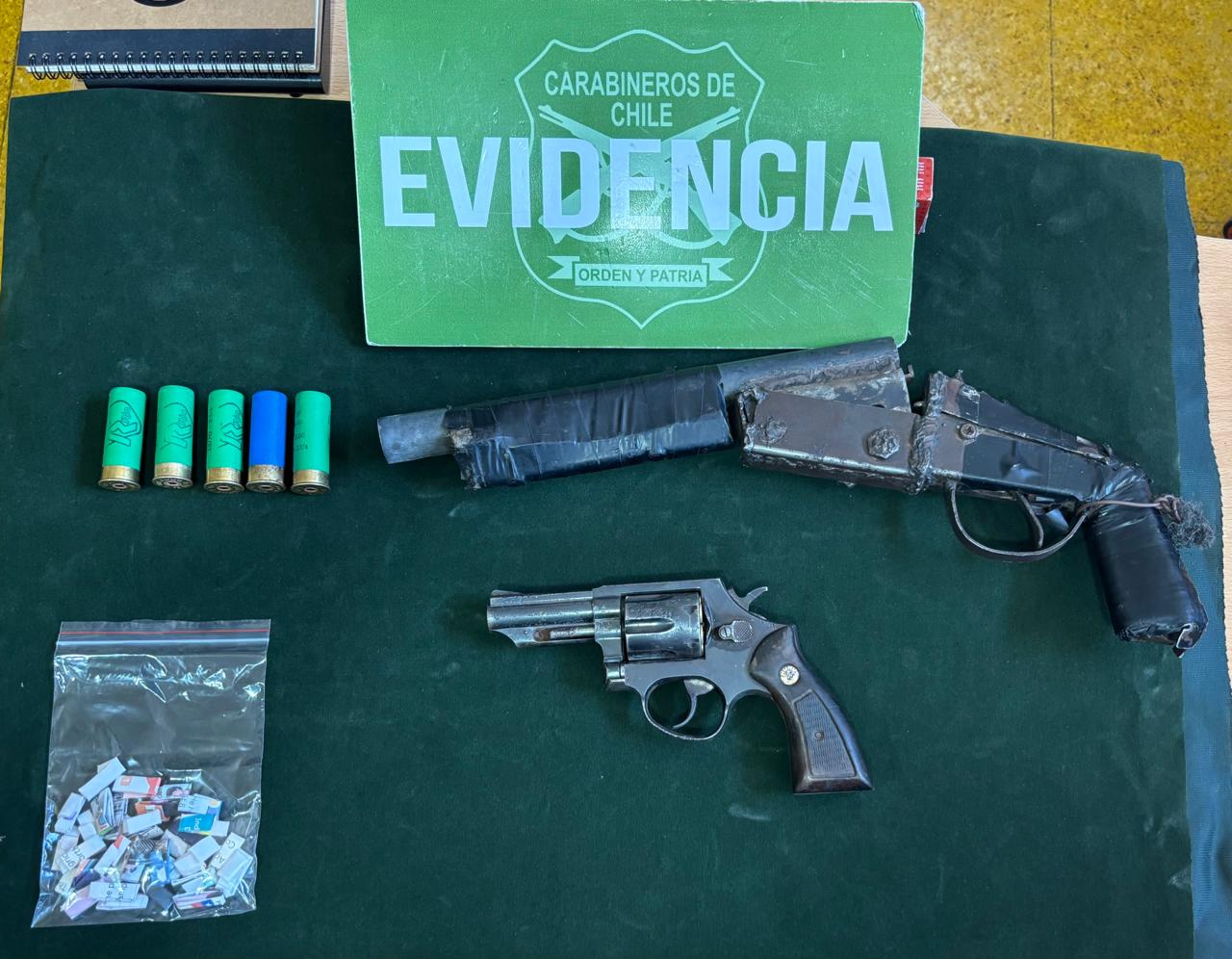 Al efectuar una inspección en el lugar, los efectivos policiales encontraron una escopeta artesanal y un revólver marca Taurus calibre .39 especial, el cual mantenía cuatro municiones en su interior. Además, fueron hallados 32 envoltorios contenedores de pasta base de cocaína.