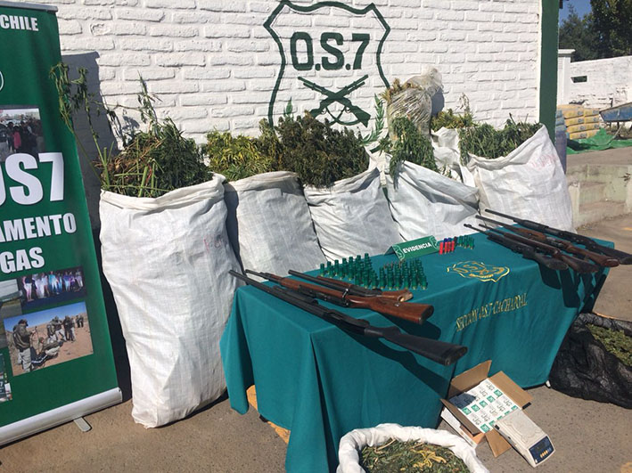 Durante un procedimiento que fue encabezado por el OS-7 de carabineros se logró dar un duro golpe al tráfico de drogas, incautando 23 kilos de marihuana elaborada, 120 plantas de cannabis sativa de cerca de tres metros de altura y 113 plantas en proceso de secado, además de armamento y abundante munición.