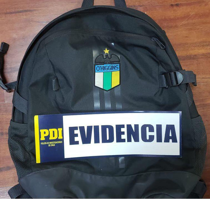 En la jornada del lunes, mientras los detectives desarrollaban diligencias en la Villa Galilea de Rancagua, se percataron de la presencia de un joven de 22 años, que portaba la mochila de exclusividad del cuerpo técnico de O´Higgins, por lo que efectuaron una inspección ocular a la especie, estableciendo que ésta contaba con sellos de seguridad de la marca, la que posteriormente fue reconocida por la víctima, siendo también detenido el joven por el delito de receptación flagrante.