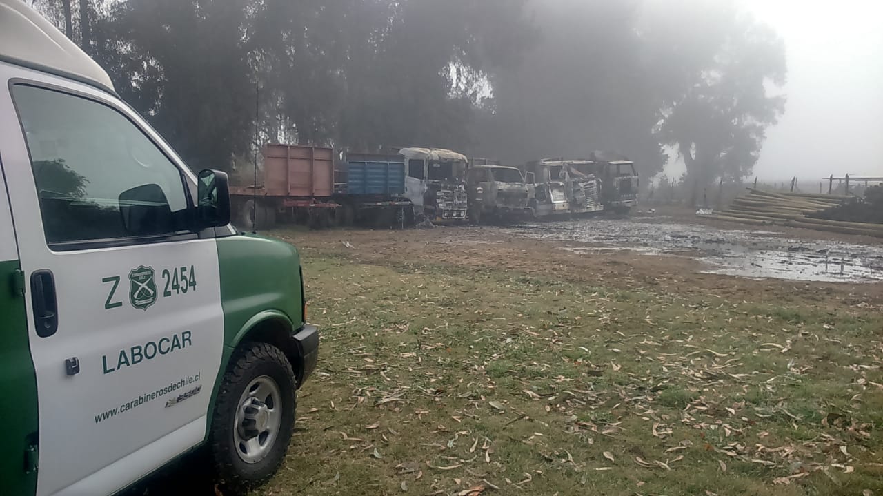 Un equipo especializado del Laboratorio de Criminalística de la Prefectura de Carabineros Cachapoal investiga el incendio que la madrugada de ayer consumió cinco camiones que se encontraban al interior de un predio agrícola situado en el límite entre las comunas de Rancagua y Graneros.