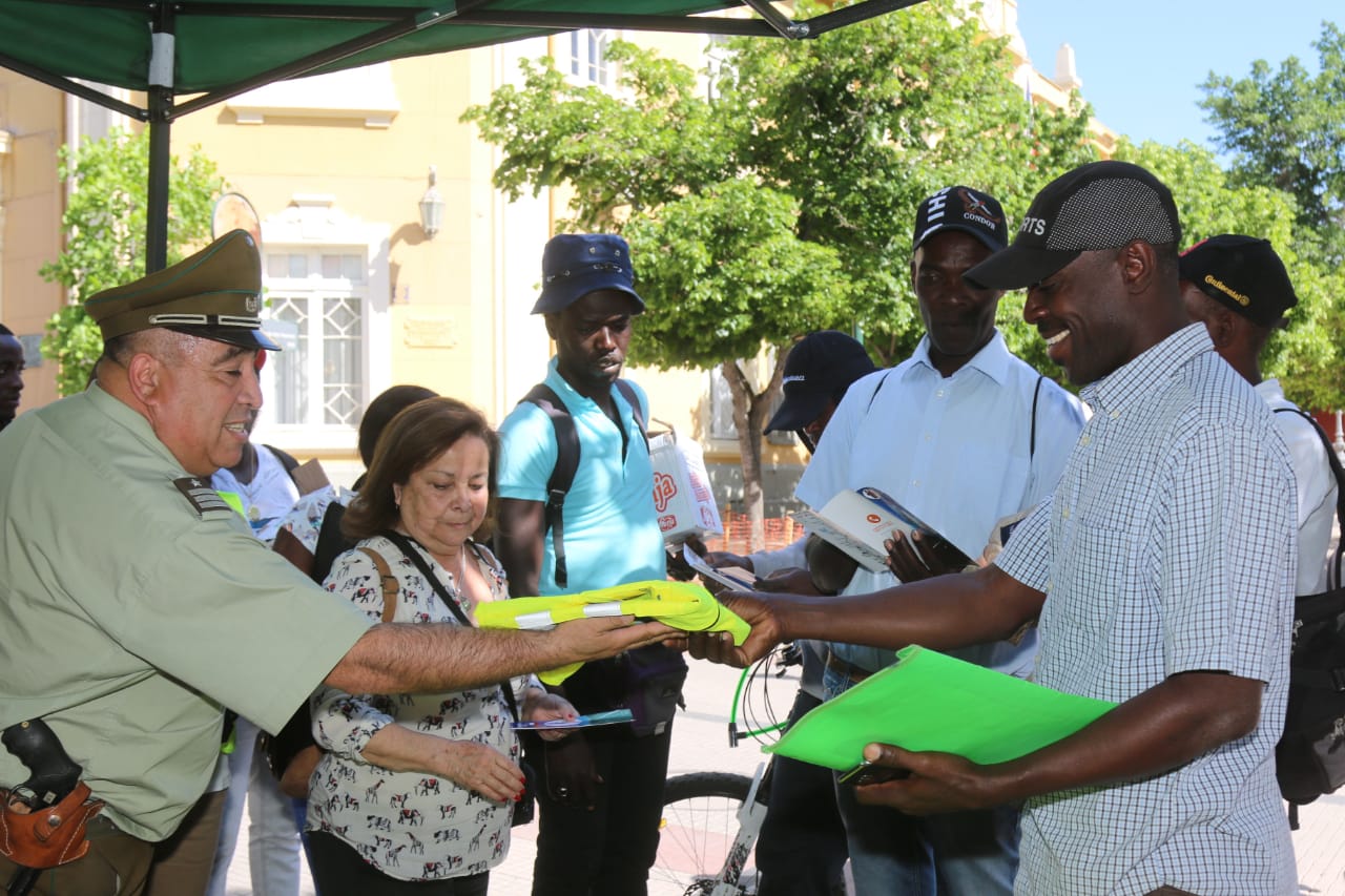 Funcionarios de la oficina del Modelo de Integración Carabineros Comunidad (MICC) de la Primera Comisaria Rancagua, en conjunto con personal de la Ruta el Maipo, a través de la entrega de dípticos y chalecos reflectantes, invitaron a transeúntes haitianos a interiorizarse sobre la importancia de conocer las leyes del tránsito.