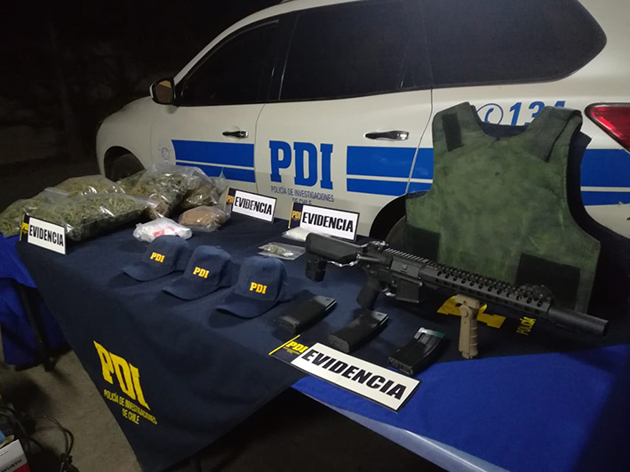 El fiscal de turno, en virtud a la evidencia obtenida por los detectives, gestionó ante el Juzgado de Garantía ordenes de entrada y registro a tres domicilios, incautando en uno de ellos, 946 gramos de cannabis a granel, mientras que en los otros, diferentes especies asociadas al delito de receptación avaluadas en más de 10 millones y medio de pesos, como además, de 1.693,7 gramos de cannabis y 528,3 de clorhidrato de cocaína, sumado a una imitación de un fusil de guerra M-4 utilizado para cometer los delitos, un chaleco antibalas de color verde, y ropa que simulaba ser de la PDI, siendo detenida una tercera persona, pero de sexo femenino.